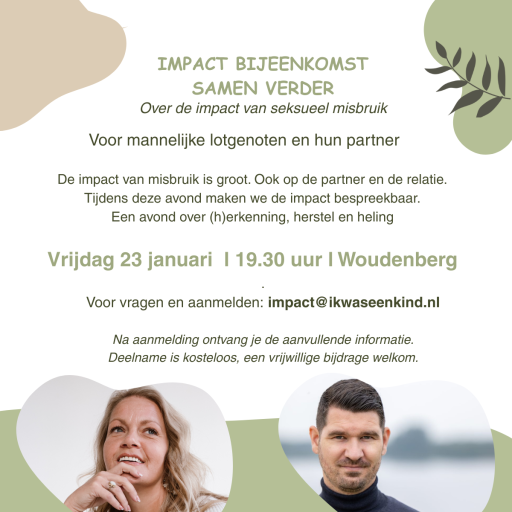 15 januari 2026 om 22:06 #282364LynLid LSGTopic starterAnneloes van ‘t Licht, uit bovengenoemde documentaire is gestart met het organiseren van bijeenkomsten voor lotgenoten, partners en naasten van. Zie bijlage. Binnenkort zal de gelijknamige website in de lucht gaan, ‘ikwaseenkind. nl’ waar alle bijeenkomsten met data op vermeld gaan worden.