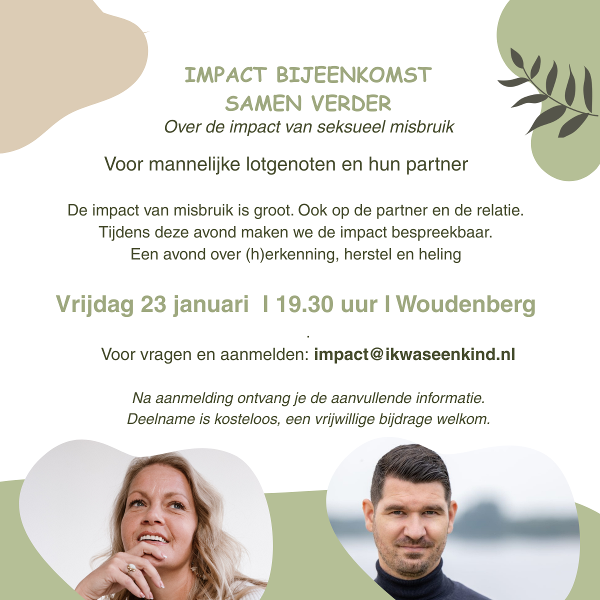 Op 23 januari is er een bijeenkomst in Woudenberg, specifiek voor mannelijke lotgenoten met hun partners, waarbij ook Lajos Scholtens (oprichter van Centrum Traumaseksuologie Nijkerk) aanwezig is als ervaringsdeskundige en traumaseksuoloog. Daarnaast zijn mannelijke lotgenoten ook welkom op de reguliere ‘Samen Verder’ avonden. In de bijlage de uitnodigingen.