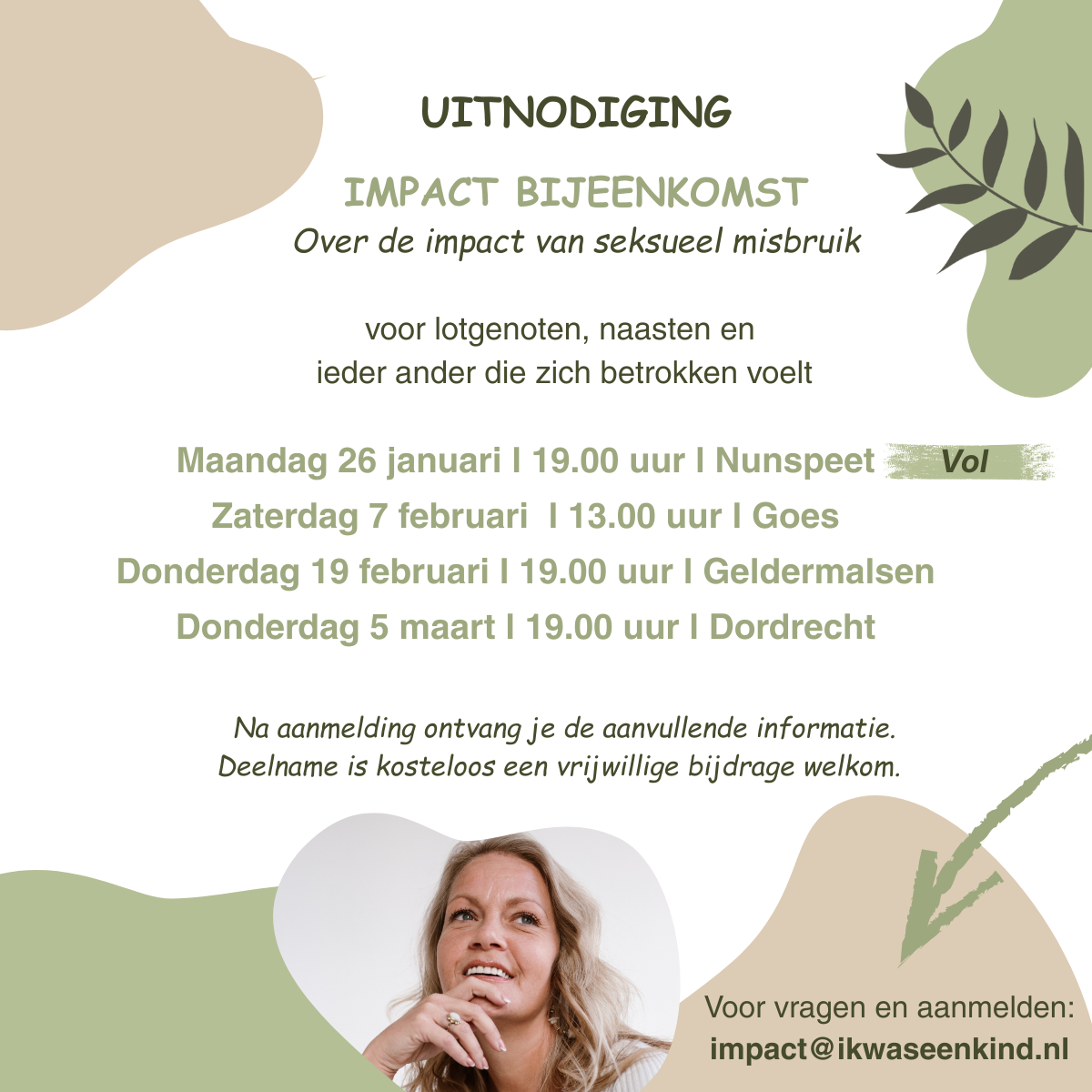 15 januari 2026 om 22:06 #282364LynLid LSGTopic starterAnneloes van ‘t Licht, uit bovengenoemde documentaire is gestart met het organiseren van bijeenkomsten voor lotgenoten, partners en naasten van. Zie bijlage. Binnenkort zal de gelijknamige website in de lucht gaan, ‘ikwaseenkind. nl’ waar alle bijeenkomsten met data op vermeld gaan worden.